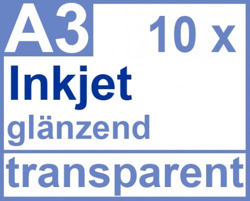 420x297 mm Format: 420x297 mm = DIN A3, Stärke: ca. 0,06 mm: Folienfarbe transparent glänzend, klar - Glasklar, Material: Kunststoff - Polyester Bedruckbar in Farbe mit allen Inkjet-, Tintenstrahldruckern: wie HP, Canon, Brother, Lexmark, Kodak etc. Klebt auf: allen glatten und ebenen Untergründen: (Kunststoff, Glas, Metall und Lackierte Untergründe) Besonderheit: Spezialbeschichtung für Inkjet: Tintenstrahl Drucker