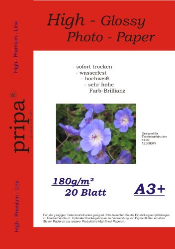 pripa 20 Blatt A 3 + , 480 x 330 mm , 180g , high-glossy ( hoch-glänzend ) - sofort trocken - wasserfest - hochweiß - sehr hohe Feature