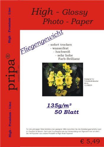 pripa 50 Blatt Fotopapier DIN A4 , 135g/qm , high -glossy (hoch-glaenzend) -sofort trocken -wasserfest-hochweiß-sehr hohe Feature